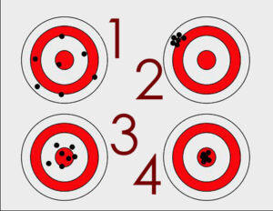 Al punto 1, si parla di BASSA ACCURATEZZA e BASSA PRECISIONE : le frecce sono sparpagliate all’interno del bersaglio.